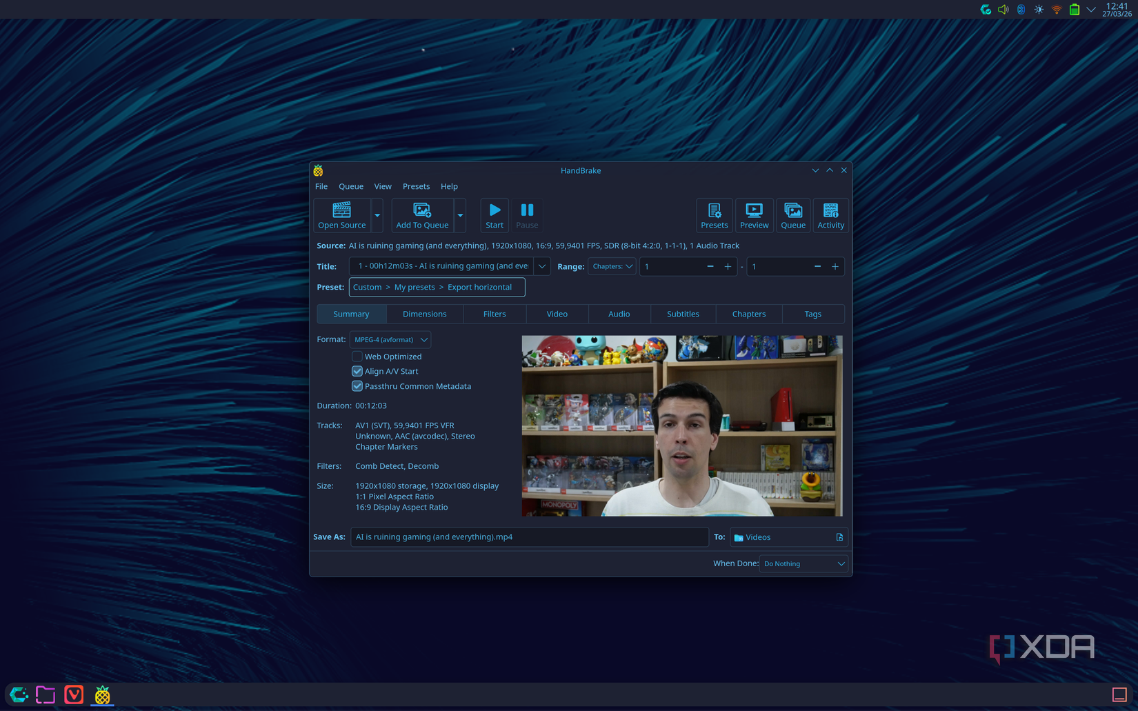I've been doing it this way because Resolve doesn't provide great options for handling AV1 output, so what I typically do is export in this format and then transcode it to AV1 using another program called Handbrake. And thankfully, that too has a Linux version that works flawlessly, so my entire workflow is there and works wonderfully.