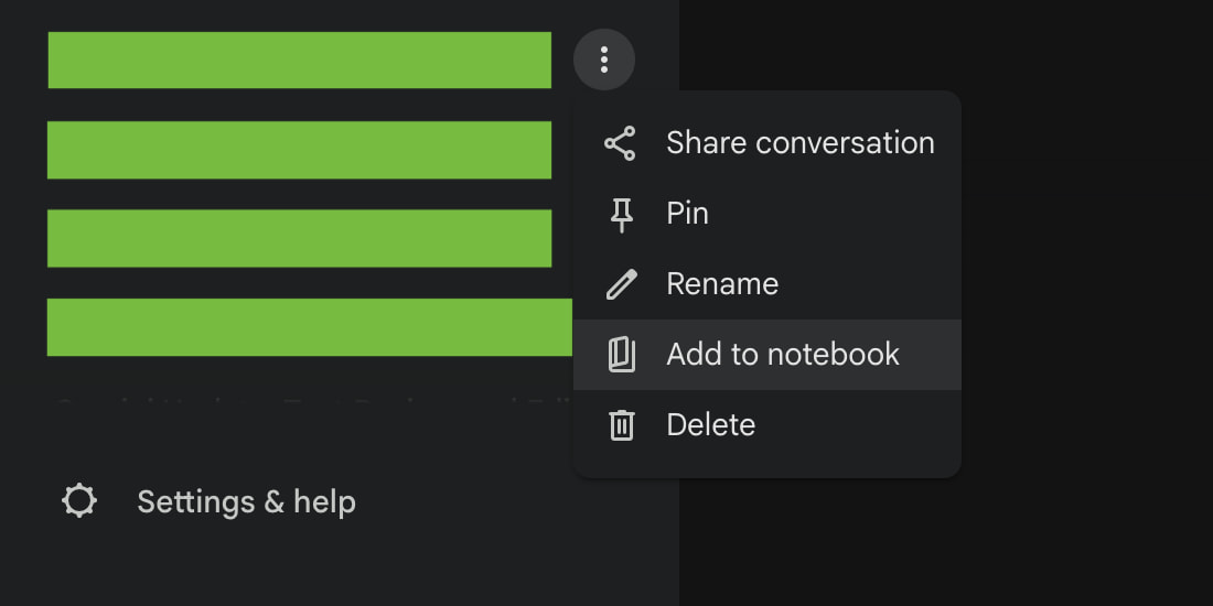 All chats now feature an “Add to notebook” option in the overflow menu. Selecting a notebook lets you ask questions with Gemini and all the existing prompt box tools. Sources are noted just above with the ability to delete and add more (Files, Drive, Websites, or Copied text).