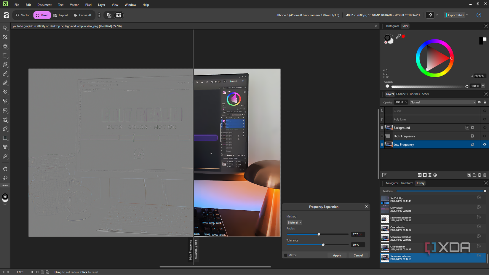 Photoshop still doesn’t have a native filter for it. You set up the stack manually (duplicate layers, apply blur, set the right blend mode, group it correctly) or download an action someone else made and run that instead. Affinity has it under Filters, one click, dialog opens with a live preview, adjust your radius, pick your blur method, apply, and your two layers are there. For something this common in professional retouching workflows, the fact that Adobe has never shipped it natively while Affinity just has it sitting in the menu is actually quite surprising.