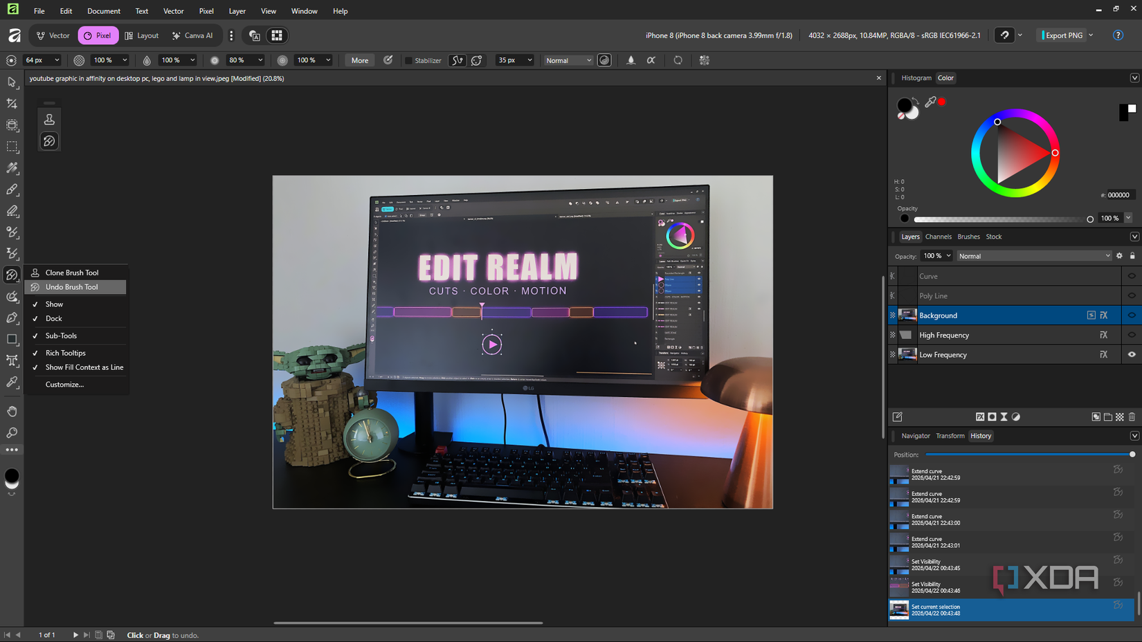 In Affinity, the Undo Brush has a small icon sitting right next to every single action in the history panel. Click whichever state you want to paint back from, pick up the brush, go. The capability is the same – you’re painting a previous history state back onto specific areas – but the affordance is completely different. It’s more visible and next to every step, so you don’t have to know it exists ahead of time.
