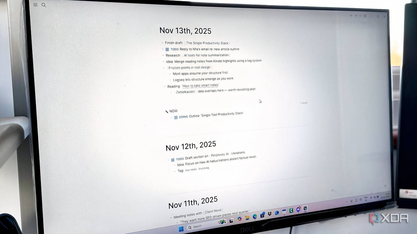 The first thing that changed: I stopped finishing sentences before saving them. In Obsidian or Notion, I'd write "Team sync notes" as a heading, then feel obligated to fill in bullet points underneath. In Logseq, I'd just write: