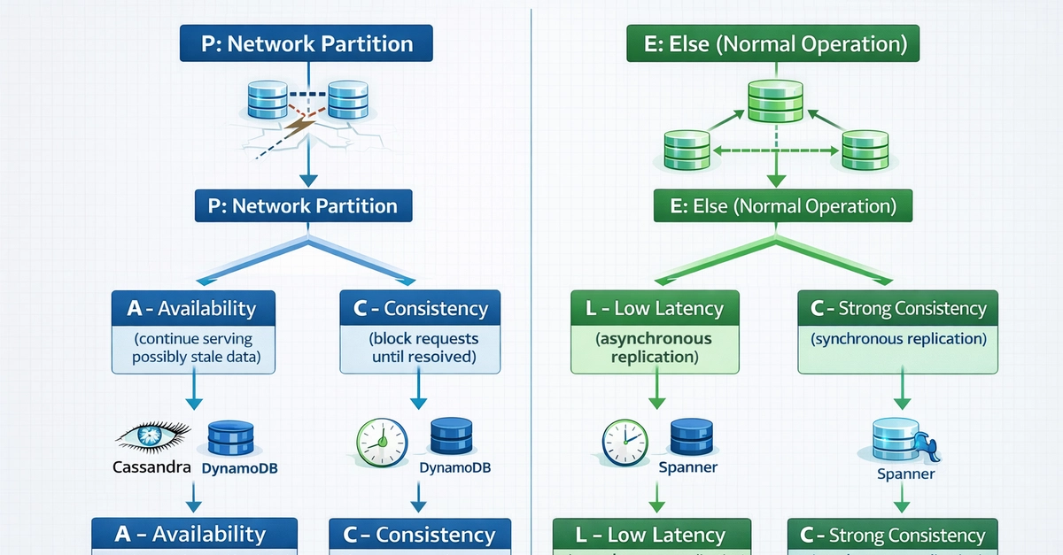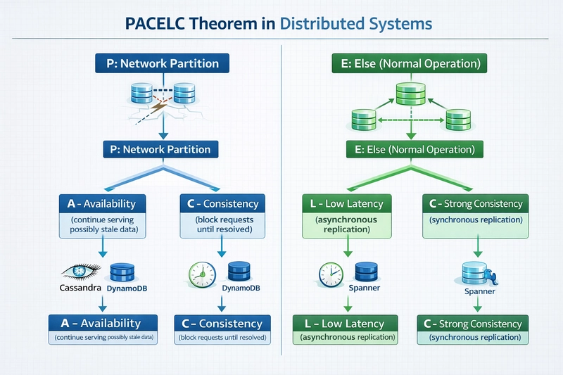 The PACELC Theorem, proposed by Daniel Abadi, bridges this exact limitation. It formalizes the reality that even without failures, designers must choose between latency and consistency. The theorem therefore expands the conversation from failure-only scenarios to the continuous operational reality of distributed systems.