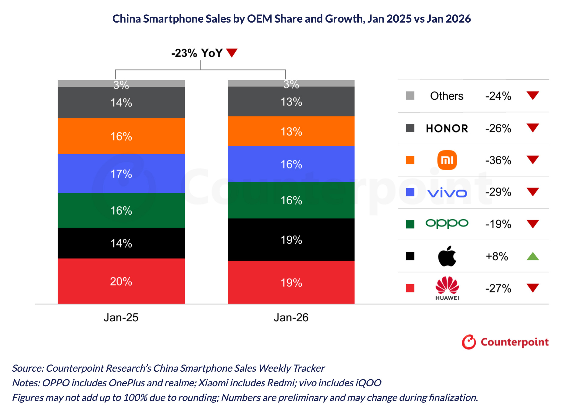 The report also noted that overall smartphone sales in the country had fallen 23% year over year that month, with Apple countering the downward trend with an 8% bump in shipments.