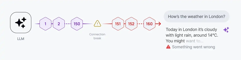 When an AI response reaches token 150 and the connection drops, most implementations have one answer: start over. The user re-prompts, you pay for the same tokens twice, and the experience breaks.