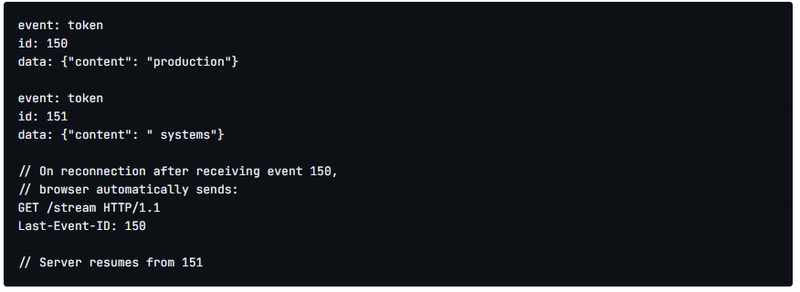 Server-Sent Events implements this natively. When an SSE connection drops, the browser automatically includes a Last-Event-ID header on reconnection. The server sees which event the client last received and resumes from there.