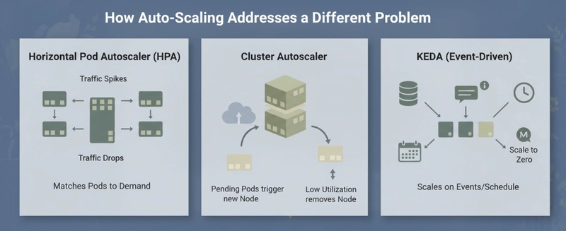 Auto-scaling is most valuable when the load is genuinely variable. A service that gets 5x more traffic at noon than at midnight should not run peak-capacity nodes all day. Auto-scaling handles that. A service that runs at steady load 24 hours a day gets nothing from HPA, but gets real savings from right-sizing.