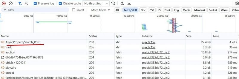 Most websites don’t do full page reloads nowadays, doing REST calls to fetch additional data. Proceed to the target, navigate to the page with the listing you want to view. Open developer tools, navigate to the network tab and set the filter to XHR. It is a bother to browse through all requests to find the one you need, so clear results. Once results are cleared, we need to trigger a new call to the search to find out our search request in the network tab. The easiest way is usually to navigate to the next page in the list. Check the request and response to make sure the target request has been detected. Usually you you can tell by the name of the request what it does, in my case it is property search: