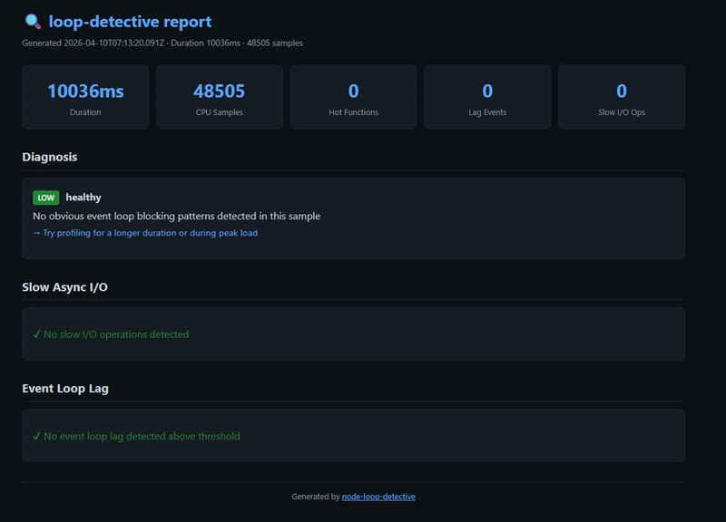 You’ve just diagnosed a production performance issue. loop-detective told you that processPayload at /app/handlers/payment.js:127 consumed 54% of CPU, that three HTTP calls to the payment gateway averaged 1.8 seconds, and that the event loop lagged 12 times during the 30-second capture.