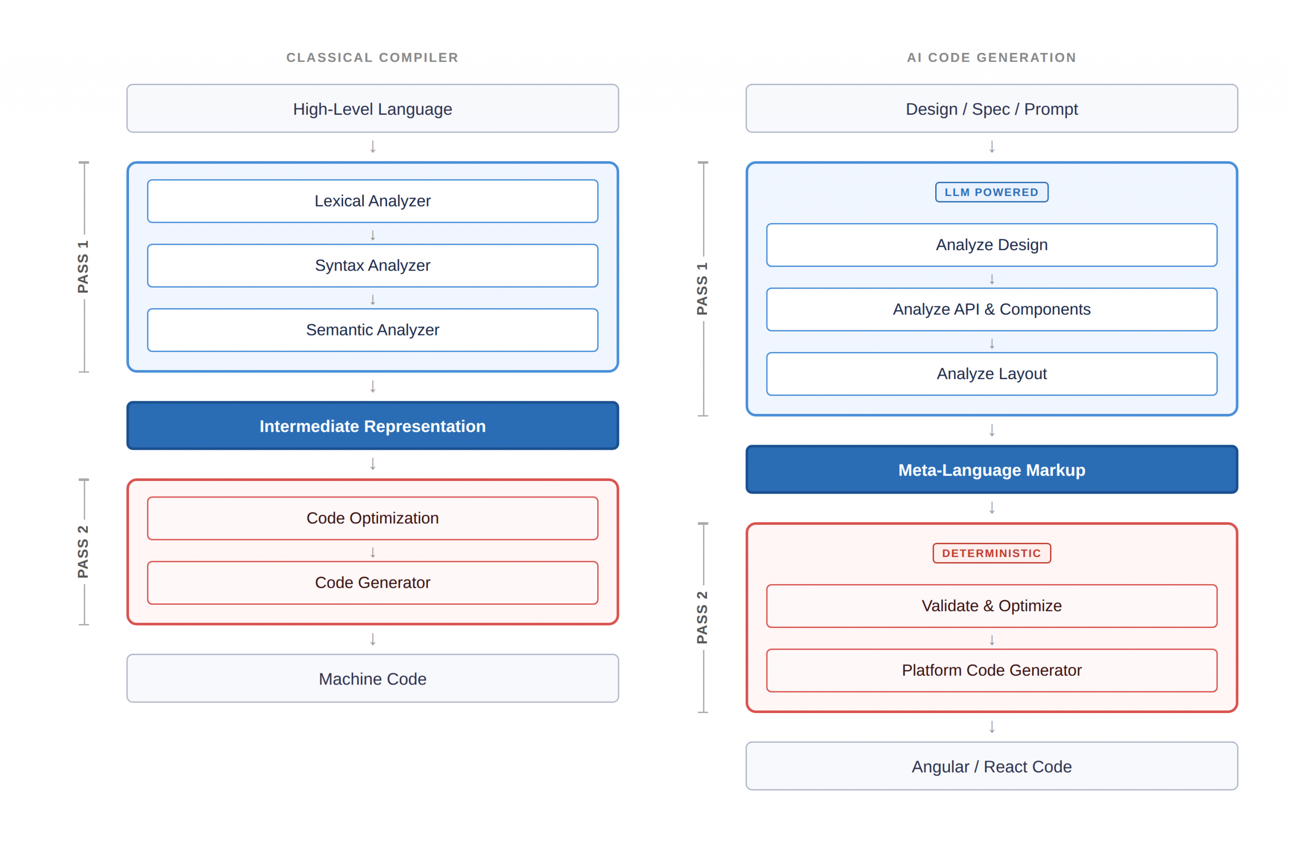 The structural parallel between classical two-pass compilation and AI-driven code generation.