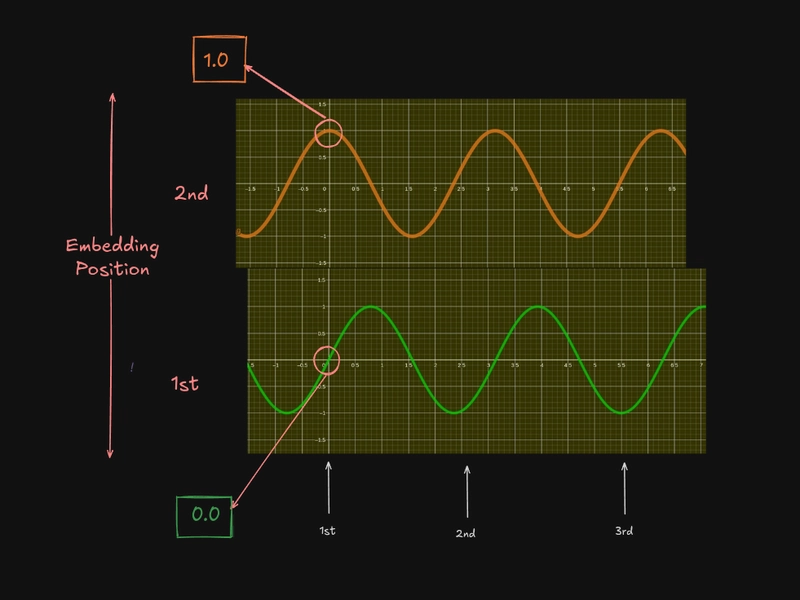 Since the <EOS> token is in the first position and has two embedding values, we take the corresponding positional values from the curves.