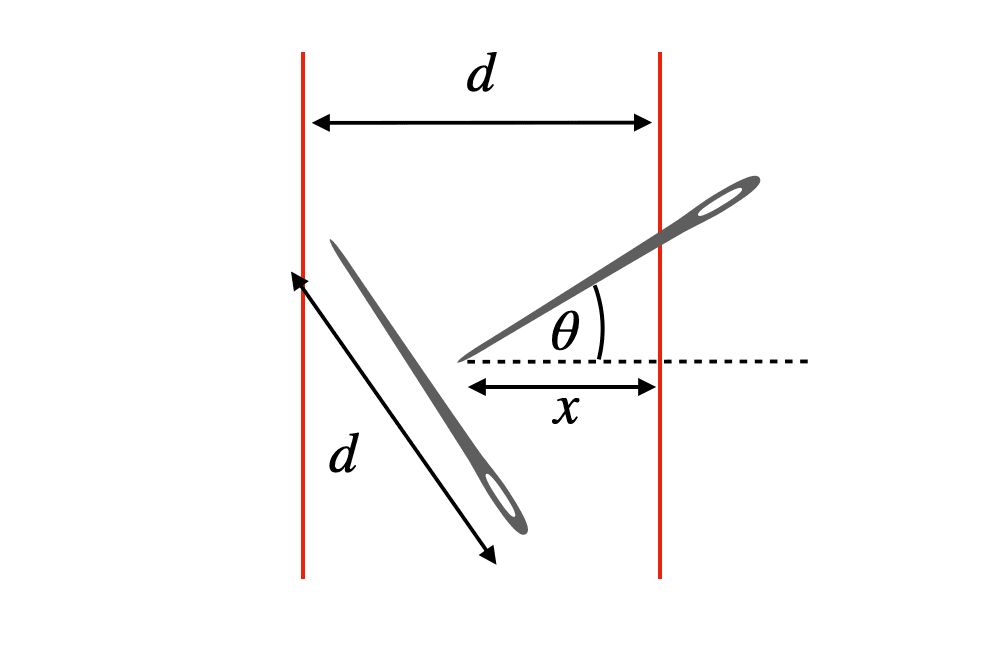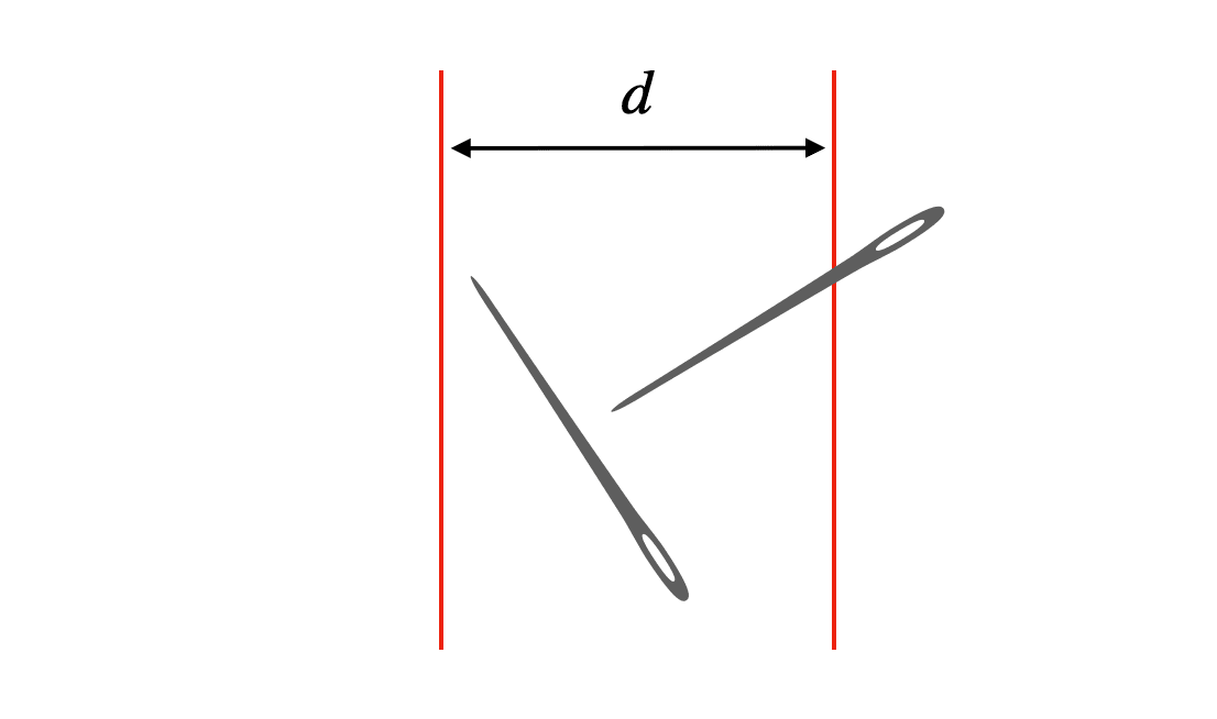 A picture will help you understand what’s happening. Let’s say I drop just two needles on the floor (feel free to replace the needles with something safer, like toothpicks). Also, just to make things easier later, we can say that the needle length and line spacing are equal (d = L).